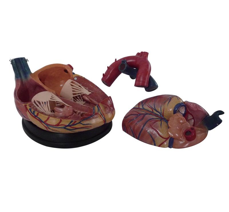 Muestra el arco aórtico, la sección coronal de la aurícula y el ventrículo, válvulas y las venas en gran detalle anatómico.